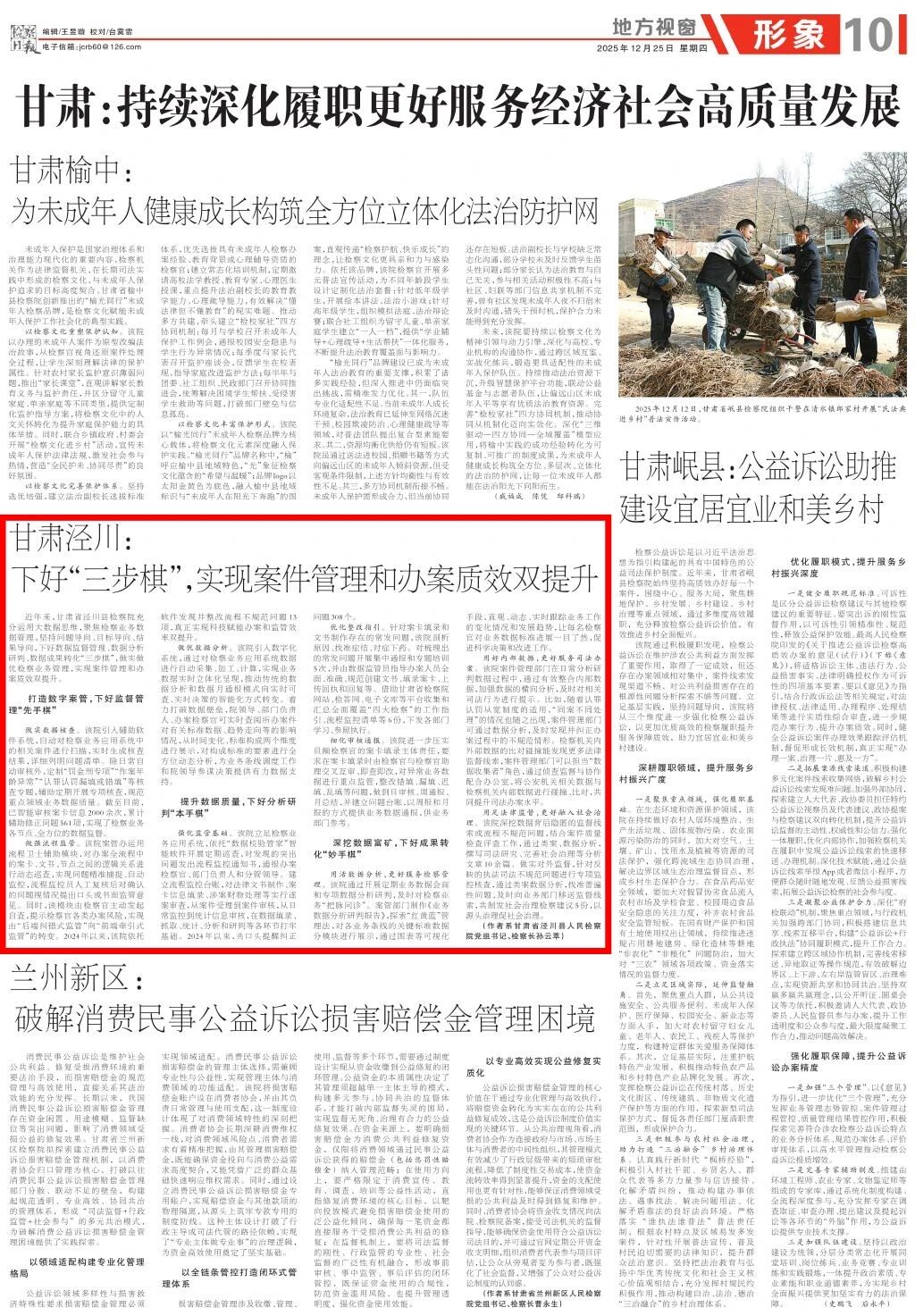 地方视窗《甘肃:持续深化履职更好服务经济社会高质量发展》专版刊发《甘肃泾川:下好“三步棋”,实现案件管理和办案质效双提升》。