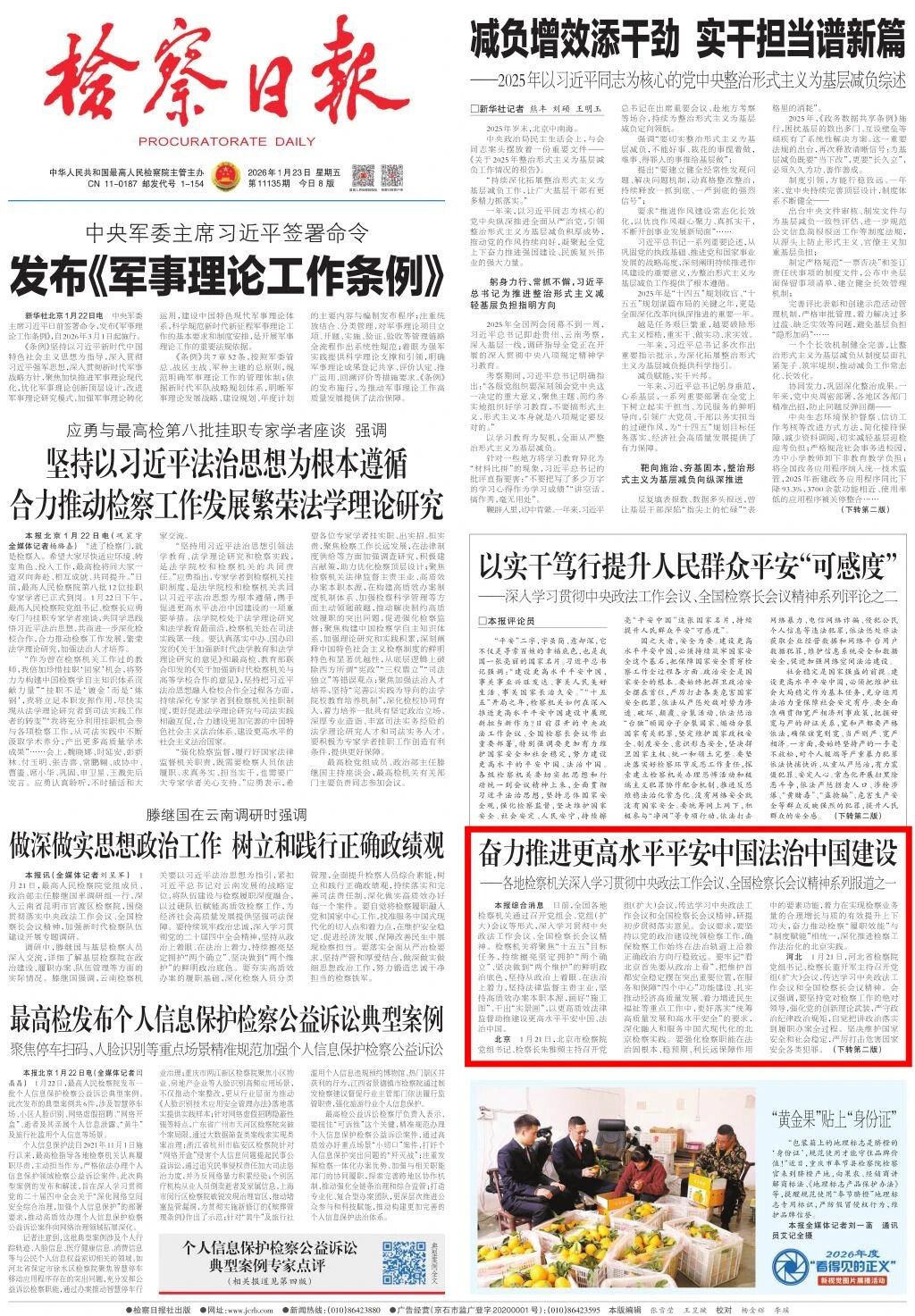 头版刊发《奋力推进更高水平平安中国法治中国建设——各地检察机关深入学习贯彻中央政法工作会议、全国检察长会议精神系列报道之一》。