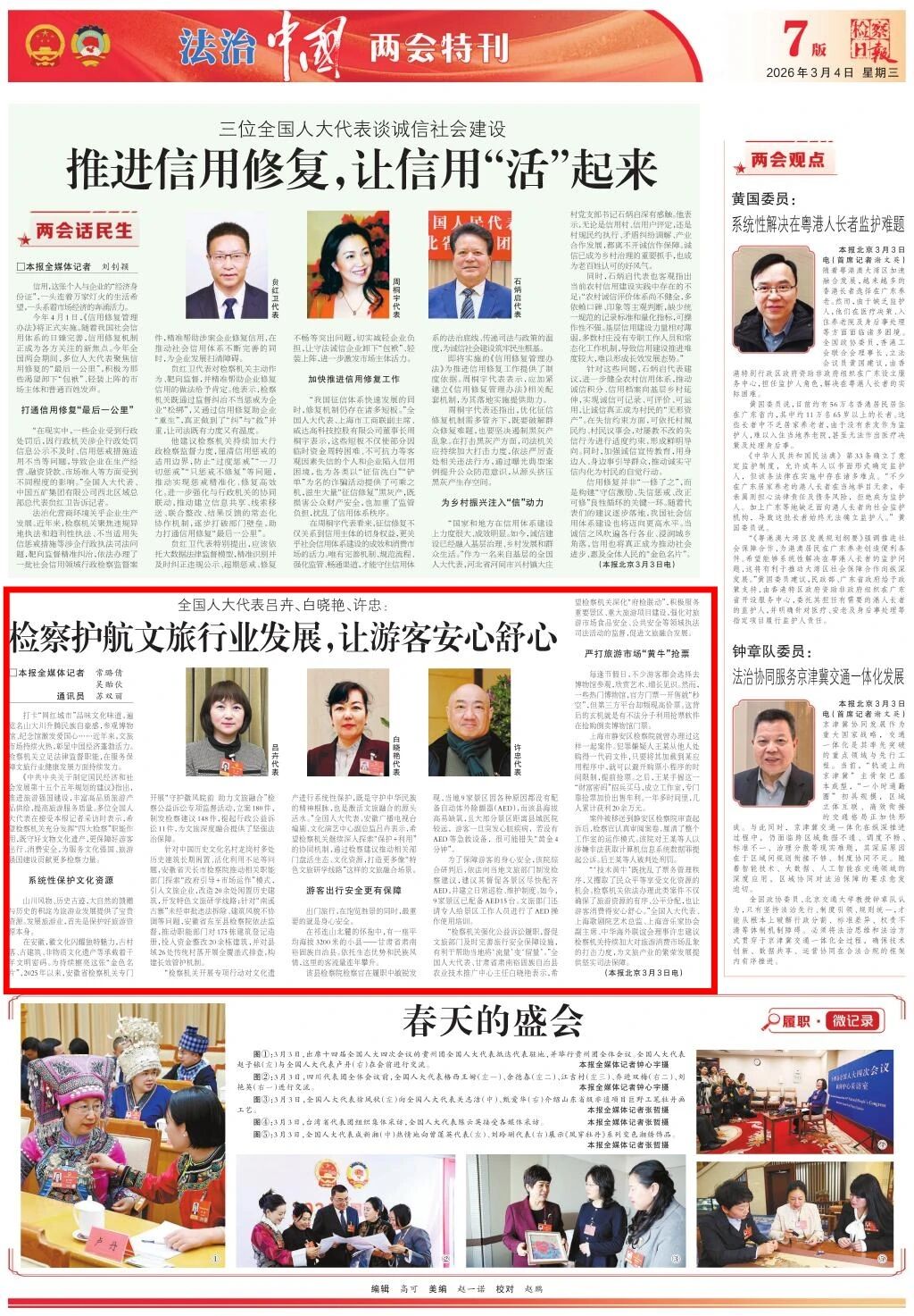 《法治中国两会特刊》专栏刊发《全国人大代表吕卉、白晓艳、许忠:检察护航文旅行业发展,让游客安心舒心》。