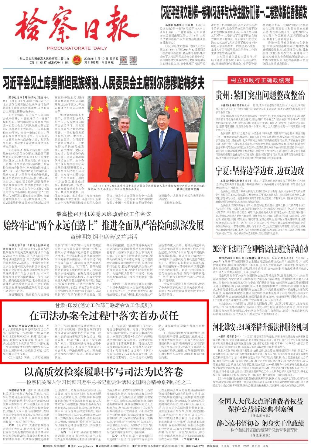 头版刊发《甘肃:印发〈信访工作部门联席会议工作规则〉 在司法办案全过程中落实首办责任》。