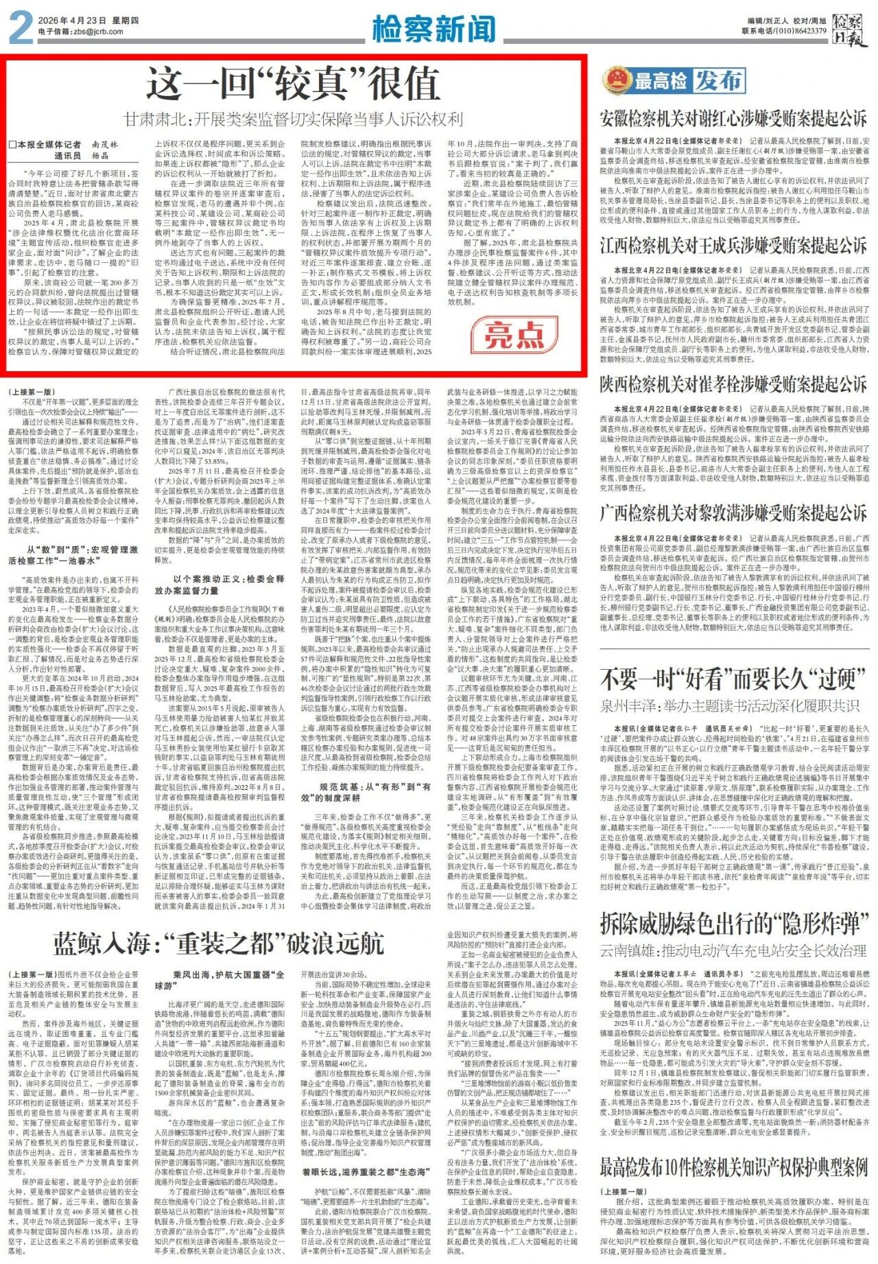 二版头条刊发《这一回“较真”很值 甘肃肃北:开展类案监督切实保障当事人诉讼权利》。